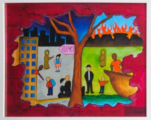 While multiculturalism contributes to the beauty and the essence of our community, Hosna believes that our neighborhood lacks the many facilities and resources needed to help families establish a better life. She is happy to hang her painting in this room because she believes that this radio station gives a voice to the ignored echoes behind the wall and inspires youth to seal the crack in their lives.
