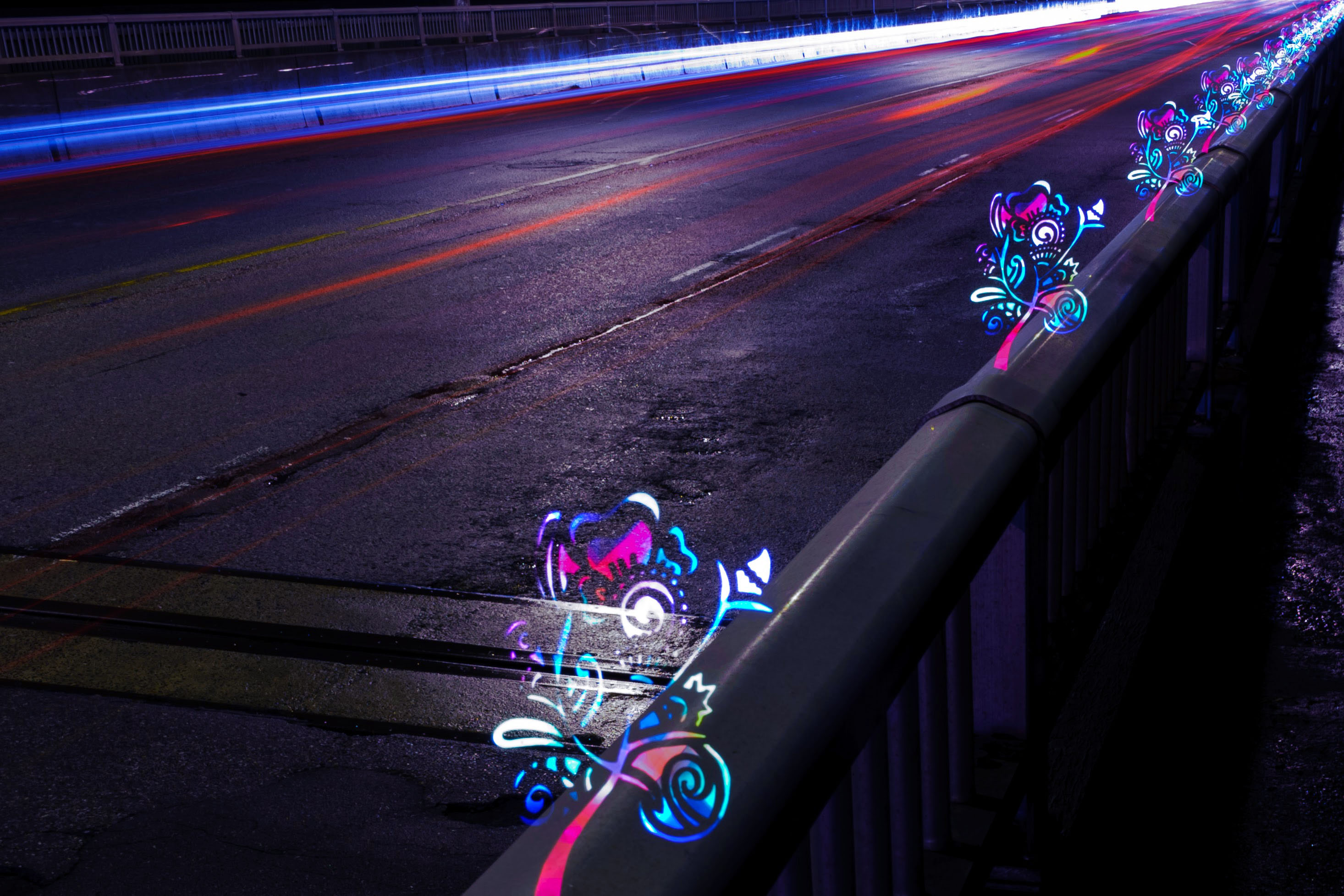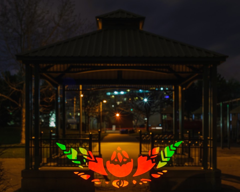 In Bring to Light, I use elements of both painting and photography to create work about the absence of cultural diversity in Canadian art. The technique involves flashing light through handmade stencils while the camera takes a long exposure shot. While my assistant controls the camera, I move around the location flashing light through stencils. Because of the shot’s length, the camera only captures the light, and I moves around unseen. I am a part of the landscape, yet invisible in the photographs. In my place, I leave light prints of henna designs. While I find henna to be a part of my personal narrative, it is incorporated universally as a symbol of festivity, celebration, femininity and craft. The images of the cityscape with the henna patterns reflect my desire to integrate the concepts of my place in both the city and in the artistic expression of the city.